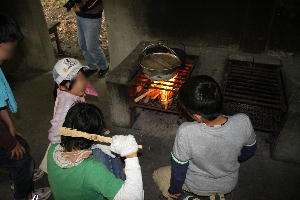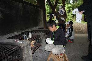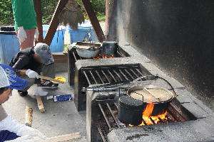 準備ができた飯ごうとカレーの鍋を火にかけて、後は炊きあがり煮えるまで待ちます。火の調整が大切です。おいしそうなにおいがしてきました。