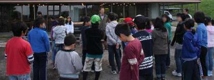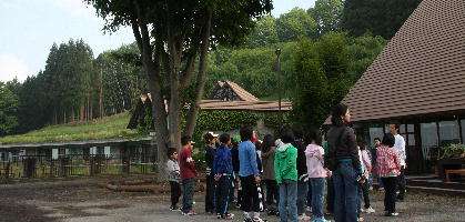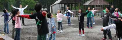 6;30、広場に集合して朝会です。ひんやりした空気のなか、元気に1日が始まります。天気はまあまあというところでしょうか。
