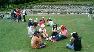 芝生に座って、おやつのアイスクリームを食べました。おいしい!