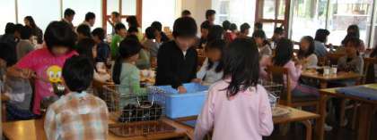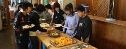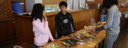 朝食です。今日もみんなより早めに食事係が食堂で準備作業をしてくれました。今朝は一応バイキング型式なので、各自が並んでおかずを自分の皿に盛りつけてゆきます。