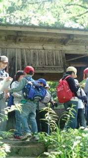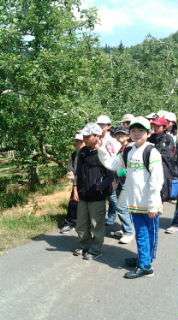 村めぐりは、中野集落の歴史や産業に関わる場所を歩いてめぐります。リンゴの木。てんぐ山のお堂。