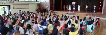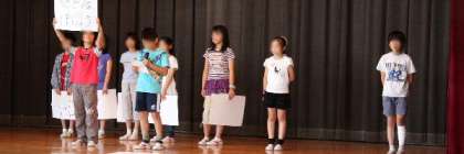 6月4日(金)、今朝の集会は、飼育委員会の発表でした。飼育委員会の活動の紹介と、世話をしているウサギについて、クイズ形式で低学年にもわかりやすく楽しく紹介しました。
