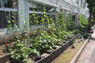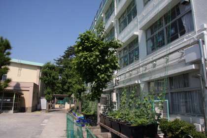 6月4日、夏を思わせる日差しのなか、西側校舎の南側に設置している「緑のカーテン」の様子です。学校エコライフ活動のひとつとして、校舎南側に大きなネットをはり、そこにキュウリやゴーヤ、ヘチマのツルをはわせることによって、日陰をつくり、さらに葉の蒸散作用によって、少しでも夏場の教室の温度上昇を防ごうという取り組みです。苗を植えてから1ヶ月余、こんなに大きくなりました。(植えたばかりの時の様子も学校日記に掲載してありますので比較してご覧ください。)