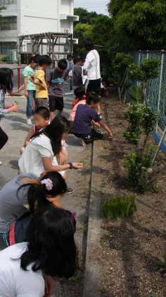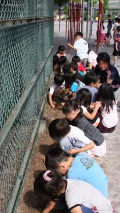 アクション月間の取り組みの一つとして、学校周辺の緑化にも取り組んでいますが、朝会のあと、校庭のまわりのフェンス際に、ゴーヤの種を児童全員でまきました。まいた種に与える水も、雨水を回収した水です。みんなで、ゴーヤが芽をだすのを楽しみに待っています。