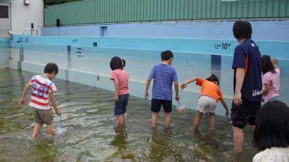 6月8日、2年生がプールで「ヤゴ救出大作戦」をしました。もうすぐプールを使用しての水泳指導がはじまりますが、それに先だって防火用水としてためていた水を抜いて、プール清掃をします。プールには、昨年産み付けられたトンボの卵がかえったヤゴがたくさん棲みついているのですが、清掃の時に水と一緒に流されてしまいます。そこで、そのヤゴを救おうと敢然と立ち上がったのが2年生です。水にはいるには少し肌寒い天気でしたが、膝ぐらいまでの水につかって元気にヤゴ救出のためがんばりました。