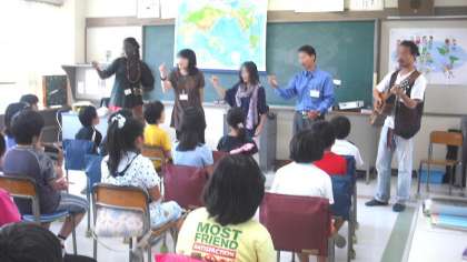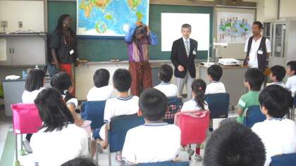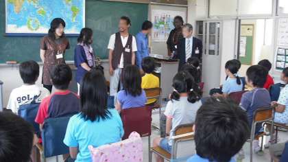 10日、4・5年生が国際理解教育に取り組みました。社団法人「国際IC日本協会」のご協力によりケニア、中国、韓国、ベトナム、カンボジア、5カ国の方においでいただき、お国の紹介をしていただき、楽しい授業となりました。地理、あいさつ、言葉、民族衣装、音楽などのことなど、たくさんのことを教えていただき、歌も聴かせてもらいました。「百聞は一見にしかず」情報だけで見聞きするのではなく、現地の方と直にコミュニケーションをとることで、理解が深まることを実感しました。