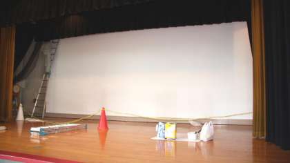 体育館舞台上、灰色の幕の後ろの壁を、区用務班の皆さんに白く塗装してもらいました。これは、秋に行われる「希望っ子発表会(学芸会)」に備えて行ったものです。つや消しの白に塗装し、スクリーンとして使ったり、照明効果を引き立てたりという目的があります。秋の学芸会にご期待ください。