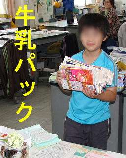 希望丘小学校は学校エコライフ活動に取り組んでいます。子どもたちも保護者の皆さんもみんな「エコレンジャー」です。職員室に牛乳パックをもってきた子のようすです。お家の方が牛乳パックを切り開き、きちんと洗って乾かしてから持ってきてくれます。枚数に応じてカードにスタンプを押してもらいます。スタンプがたまると、学校でとれた作物がプレゼントされます。(現在少しずつキュウリが収穫されています。順番で子どもたちに渡していますので、まだの方はもうしばらくお待ちください。)