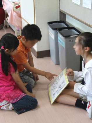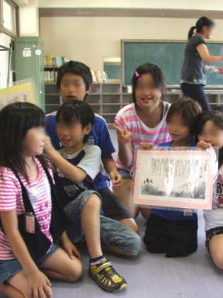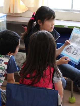 6年生が1年生に世田谷の昔話の読み聞かせをしている時のようすです。どちらも真剣でいっしょうけんめいでしょう。