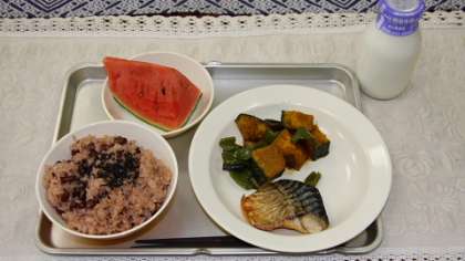 17日開校記念日の給食です。お祝いの日といえば・・・そう、もちろんお赤飯です。そして、この季節ならではの「夏野菜の南蛮かけ」と「スイカ」、「サバの塩焼き」です。行事や季節感も大切にして給食献立をつくっています。
