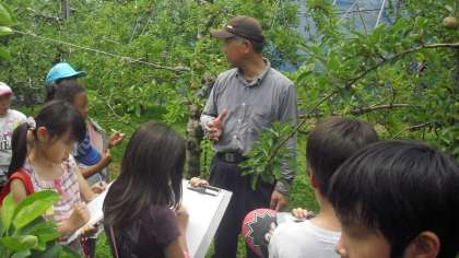 18日、3年生が近隣にあるリンゴ園を見学に行きました。見学は2回目です。リンゴ園の農家の方にお話を聞いて、前回との違いを見ました。