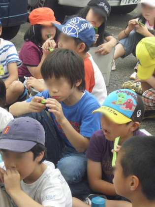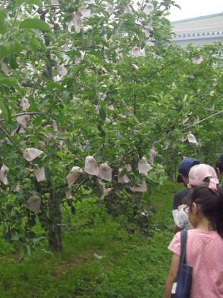 前よりもずいぶん大きくなっているリンゴ、そして袋をかけてある様子をよく観察しました。最後に採れたてのキュウリをいただき食べてきました。