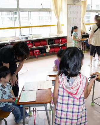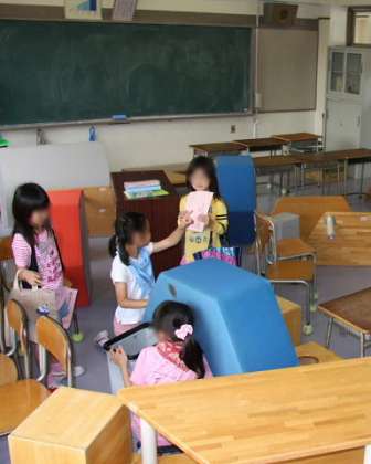 それでは、今日のお店のようすを紹介しましょう。2年生は「ボーリング」と「まちがいさがし」(写真左)、「たのしいにょろにょろめいろ」(写真右)です。ボーリングはペットボトルに水をいれてピンにしています。けっこうむずかしくてなかなかピンがたおれません。「まちがいさがし」は手作りした2枚の絵のちがいを見つけます。細かいところまでよく描いてあって、これもなかなか難しい!「たのしいにょろにょろめいろ」は、机やいすでしきった迷路の途中にクイズを出してくれる子がいて、それに答えるとゴールに行けます。2年生よく頑張っていました。