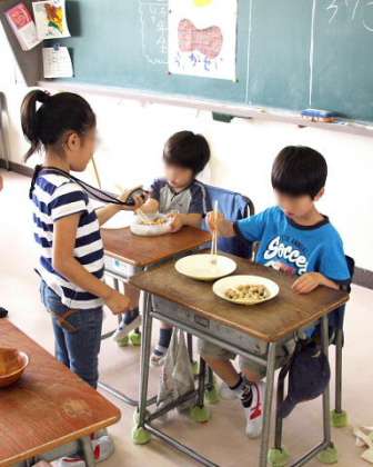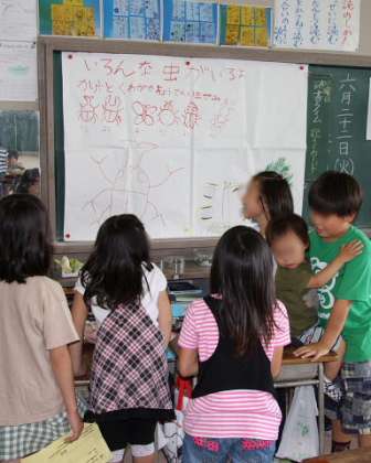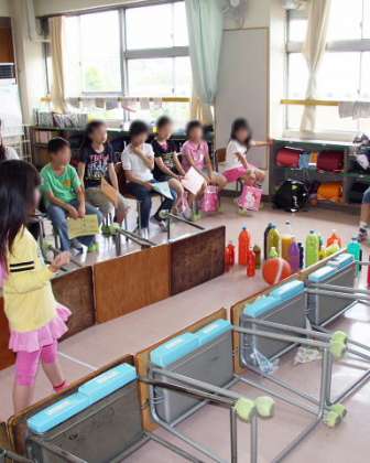 3年、「サッカーボーリング」は文字通り、ペットボトルのボーリングピンをボールをけってたおす迫力満点のゲーム。「こん虫さがし」は、机で囲んである一角に、手作りの昆虫が隠してあって、それを探すゲーム。「豆つかみ」は低学年は落花生を、高学年と大人は大豆を、割り箸を使って皿から皿へ移すゲームです。どのゲームも手作り感あふれる楽しいお店でした。