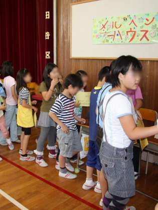 6年生は体育館ステージの幕の中で、題して「メルヘンハウス」・・・名前とは裏腹のお化け屋敷です。受付は長蛇の列の大人気。中には扮装した6年生が控えています。大人もびっくりの1シーンです。