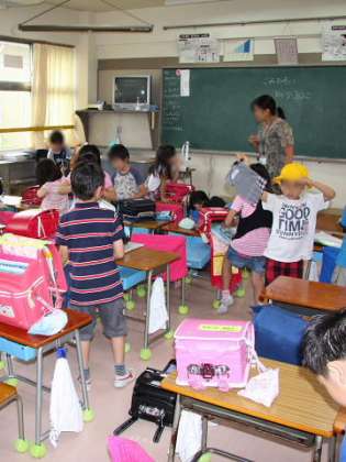 19日(土)、学校公開日の午後、東海地震警戒宣言発令時を想定した児童引き取り訓練を行いました。13時30分発令の想定で、13時40分、校内に放送をいれて指示、各クラスとも帰りの準備をして引き取りを待ちます。