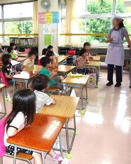 学校公開週間最終日の23日、1年生が生活科の学習で「梅ジュースづくり」をしました。この梅は学校の敷地内で獲れたものです。季節感を大事にするとともに、身近なものでおいしいものを作り、自然のありがたさを感じさせる目的もあります。教室には授業参観に訪れたお家の方もいらっしゃいました。