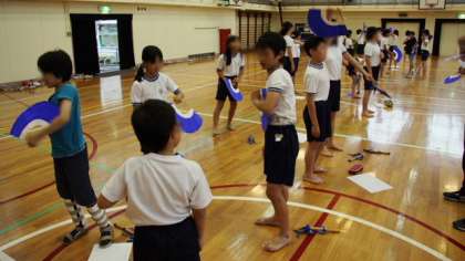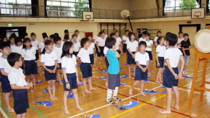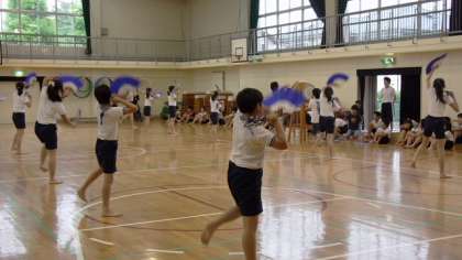 この日はその第1回目で、はじめに6年生が昨年の経験を生かして見事な踊りを披露し、その後、6年生が「師匠」となって、5年生に基本から教え始めたところです。運動会が楽しみですね。