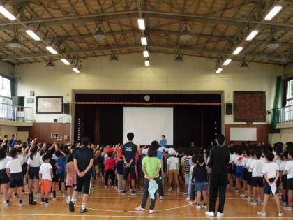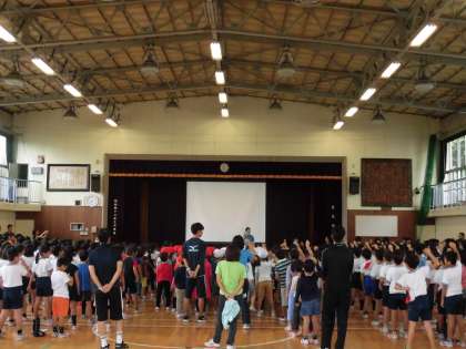運動会の歌「ゴーゴーゴー」を元気よく歌い、体育館に歌声が響いていました。整列も今日は紅白に分かれており、まさに運動会シーズン真っ只中です。伴奏は音楽クラブの人たちが担当しています。素晴らしい演奏でした🎶