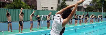 25日、3・4校時は5・6年のプール開きです。月曜日に1・2年生がプール開きをしましたので、これで全部の学年の水泳指導が始まったことになります。はじめにプール開きの儀式を行いました。学級の男子代表と女子代表4人が、今シーズンの決意と目標を、マイクなしではっきりした口調で述べることができました。準備体操をしていよいよ水にはいります。