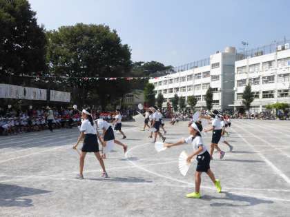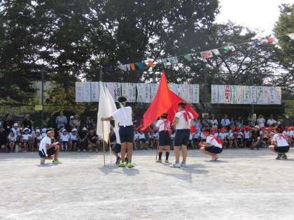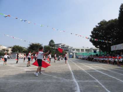 応援合戦です。団長さんを中心に紅組も白組も精一杯応援しています。
