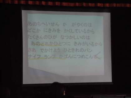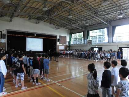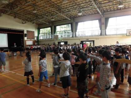音楽集会です。今月の歌は「君をのせて」です。元気な歌声が体育館に響いています。