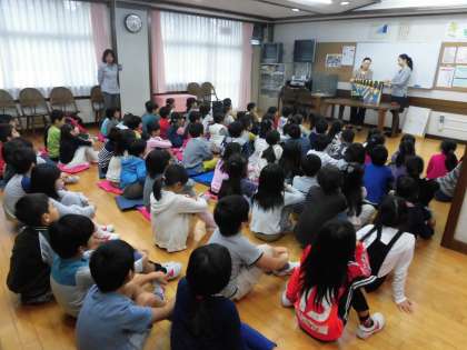 朝の読書の時間に1年生の読み聞かせがありました。みんな楽しそうに聞いています。