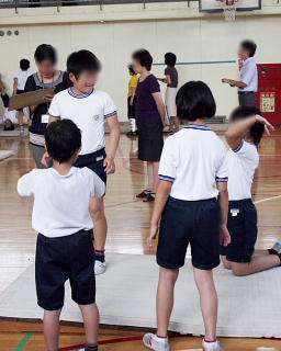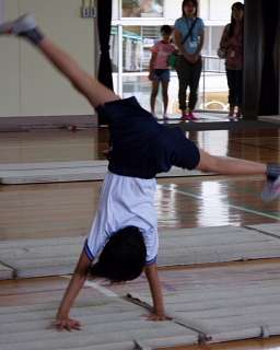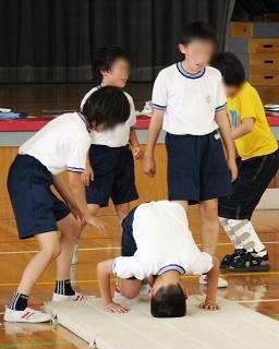 授業のようすです。(写真左)見事な腕立て側転の見本演技。(写真中・右)教え合い励まし合いながら練習が進みます。