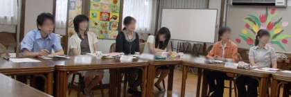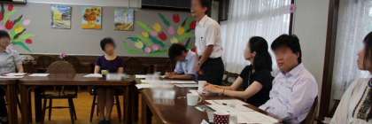 研究授業の後はランチルームで、授業について話し合い、講師の先生からご指導をいただきました。授業の記録も分担してとってあります。この積み重ねが、教員の授業力を高めます。