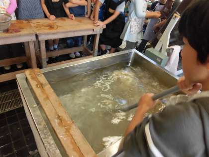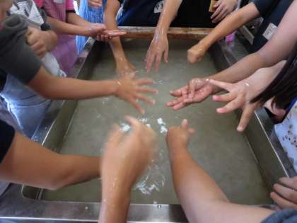 最後は和紙作りです。原料をかき混ぜたり、手で触ったりしました。出来上がりが楽しみです。