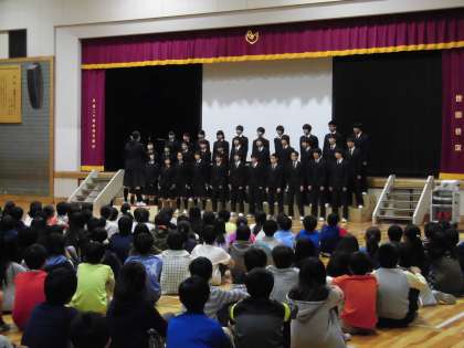 船橋希望中学校で見学会がありました。中学3年生が校内を案内してくれました。実際の授業風景を見たり、いろいろな教室や施設を見せていただきました。また、3年生のクラス合唱も聴かせていただきました。素晴らしい合唱でした。さすが中学生です。6年生にとって良い体験となりました。