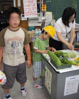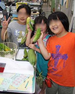 希望丘の子どもたちは全員がエコレンジャーです。職員室に家でたまったペットボトルのキャップや、牛乳パックを持ってきます。持ってきた子には、グリーンカーテンで育っているキュウリやゴーヤをプレゼントしています。