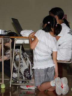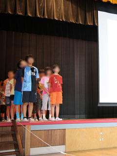 発表にがんばる5年生の子どもたちのようすです。スクリーンに映し出すパソコンの操作も、5年生が行いました。発表は、全員が前をしっかり見て、大きな、はきはきした声でできました。