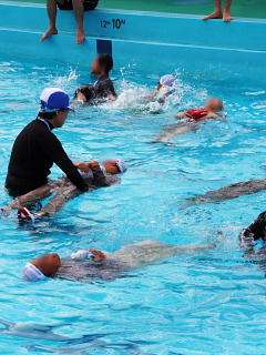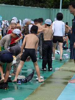 服を着たまま浮くのも大変なのに、泳ぐのはもっと大変です。万が一の時は長い時間浮いていることが大事です。最後にずぶ濡れになった衣服や履き物を脱ぐのもまた大変でした。服を着たまま水に落ちるようなことはないにこしたことはありませんが、万が一に備えて、このような体験をしておくことも大切だと考えて、本校では毎年実施しています。