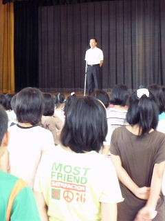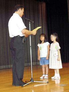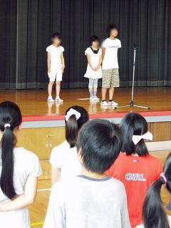 終業式のようすです。左:学校長の話。中:児童代表3人の話。右:エコクラス表彰