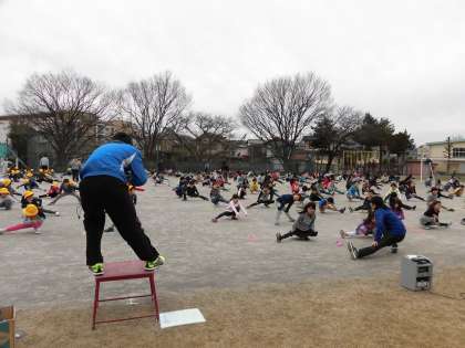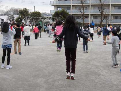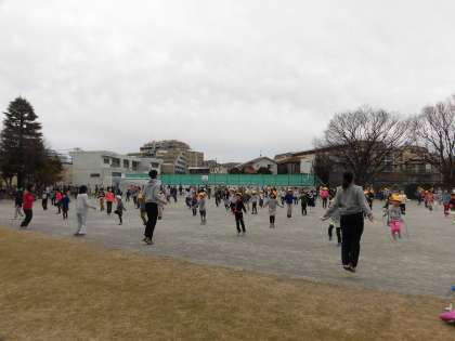 冬の冷たい風が吹く中、子どもたちは元気に縄跳びをしています。準備運動から、リズム跳びまで、楽しく跳んでいました。先生たちも頑張っています。