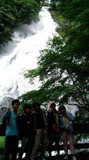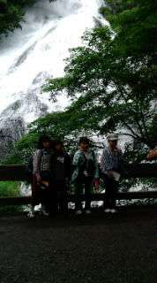 湯滝を見上げて記念撮影!水しぶきで涼しい!