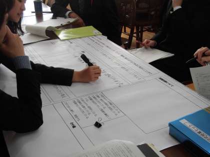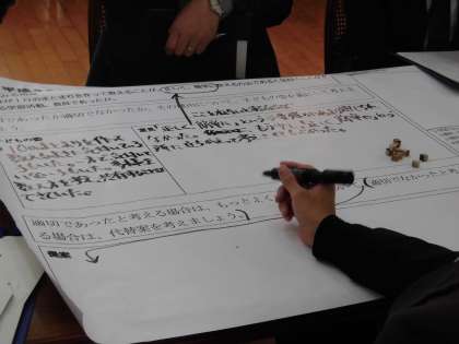 先生方のお勉強会です。授業力を向上させるために、放課後全員で研修を行っています。講師は校長先生です。真剣に話し合っています。