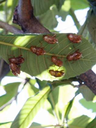 プールの西側、本村公園との間の木のところでみつけたセミの抜け殻です。たくさんくっついています。ほとんどがアブラゼミですが、ミンミンゼミもあります。見上げたところ、葉っぱの裏にびっしり!(写真右)びっくりです。
