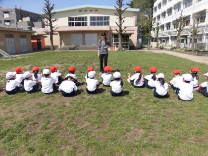 今日(4月20日)の2時間目は、1組はひらがなの学習、2組は道徳の教科書を使って、「みんなが使うもの」についての学習、3組は芝生で、2列・4列の並び方の学習をしました。