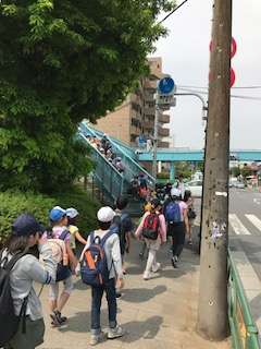 縦割り班ごとに、手をつないで、仲良く歩きます。