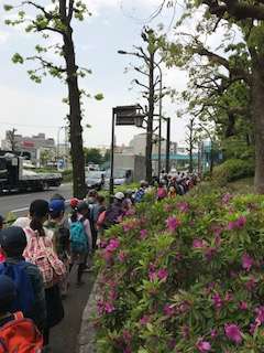 歩道橋から歩道まで、長い列が続いています。