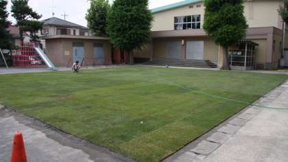こうして、昼前には体育館前の校庭が芝生になりました。あっという間にできあがったのでびっくり!気持ちのよい空間ができあがりました。しかし、これはあくまでもお試し期間限定で2月までの設置となり、この間に子どもたちのようすや芝の状態を観察し、今後本格的に導入するかどうか検討することになります。また、芝が落ち着くまでしばらくの間立ち入り禁止になります。2学期開始早々には、芝生の使い方を子どもたちに伝えて、使えるようにします。楽しみ待っていてくださいね。