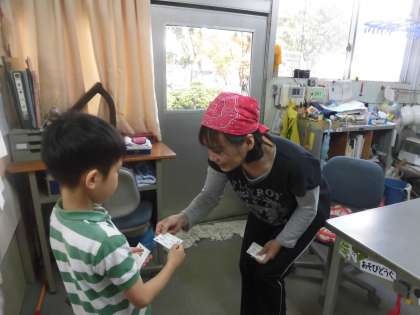 自己紹介をしたり「失礼します」「失礼しました」と言って、職員室の出入りをしたりと緊張しながらも一生懸命に活動しました。あくしゅをしたあとに名刺をいただいて喜ぶ様子とても微笑ましい姿でした。