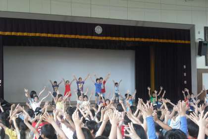 歌の途中からはダンスをしながら歌いました。「レインボーキッズ」が前に立ち、ダンスの見本をしめしました。楽しい音楽朝会でした!
