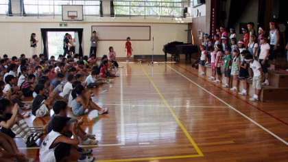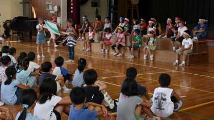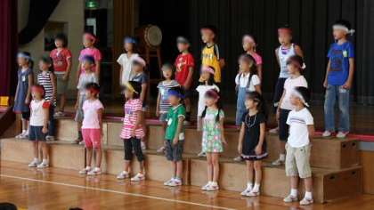 3日(金)朝の児童集会は、2年生の群読の発表でした。この日も朝から暑く、体育館の気温も高い状態。発表の2年生はいつもより少し早く体育館に集まって、暑い中最後のリハーサル。今日の発表は北原白秋の紙「お祭り」の群読に挑戦です。全員額にはちまき、御神輿をくりだすなど趣向をこらし、新学期が始まってまだ間もなく、暑い中での発表ということで大変でしたが、2年生の子どもたちは精一杯がんばり、これもまた、暑い中静かに聞くことのできた1年、3年から6年生も大きな拍手を送っていました。朝早くから、多くの保護者の方にもおいでいただき、聞いてもらうことができました。