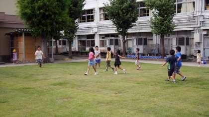 さて、久しぶりのまとまった雨に、からからに乾いていた地面が潤って、植物の緑が今日は鮮やかに感じられました。ここで一気に秋が来るのかと思っていましたが、午後からの日差しで気温が上昇し、本格的な秋風がふくにはもう少し日がかかりそうです。2学期から使用した芝生は、やはり仮設で根が深くはってないということもあり、一部の状態はあまりよくない状況ですが、子どもたちは喜んで遊んでいます。