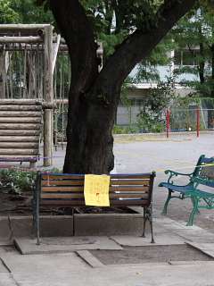 校舎東側の桜の木に毛虫が発生しています。長さ5センチ程度のモンクロシャチホコという種類で、皮膚についても特別に過敏な人でなければかぶれたりすることはありません。この時期に木から下りてきて地中に入り、サナギになるのだそうです。危険はありませんが、木の下に表示をして、注意を促しています。