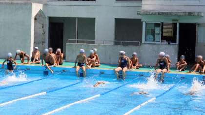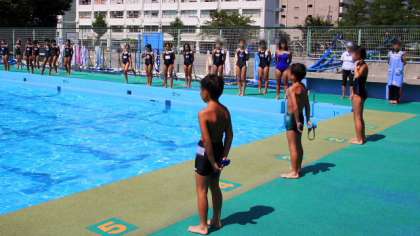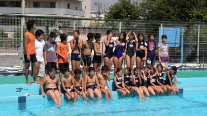 今シーズンがんばった成果を、どの子もこのひと泳ぎに力一杯出します。泳ぎが得意な子にとっては最高の舞台となりました。そして、水泳がちょっと苦手だという子にとっても、勇気をふるって参加し、皆から認めてもらえる場になりました。記録会で初めて25m泳げた子や、自己新記録を達成した子、泳ぎが苦手なのに途中で立ってしまっても最後までがんばった子など、すばらしい子どもたちです。そしてまた、それぞれに温かい声援を送った5・6年生の子どもたちもすばらしいと思います。最後にプール納めの式をやって、代表の子がこれまでの成果とこれからの抱負を述べました。終了後、6年生は思い出として、みんなで記念写真を撮りました。