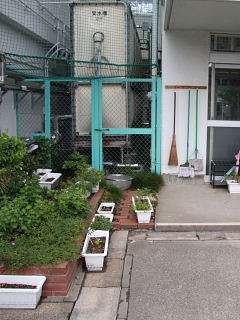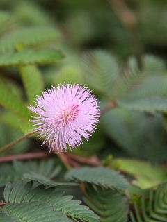 正面玄関、校庭側の玄関に咲いたオジギソウの花です。